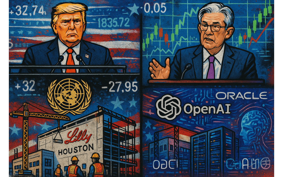 US President Donald Trump delivered a combative speech at the United Nations General Assembly, Federal Reserve Chair Jerome Powell warned of two-sided risks in the economy, Eli Lilly unveiled a $6.5 billion investment in Texas manufacturing, and OpenAI joined Oracle in planning a major data hub expansion in the state.